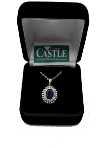 CLAIMED: The Castle Jewelry : Oval Lab grown sapphire necklace with a halo of lab grown round brilliant cut diamonds crafted in sterling silver. Retail value $399